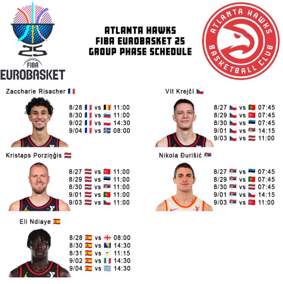 今夏的欧锦赛老鹰队也有5人参战:法国里萨谢、捷克克雷伊奇、拉脱维亚波尔津吉斯、塞尔维亚久里希奇、西班牙恩迪亚耶。