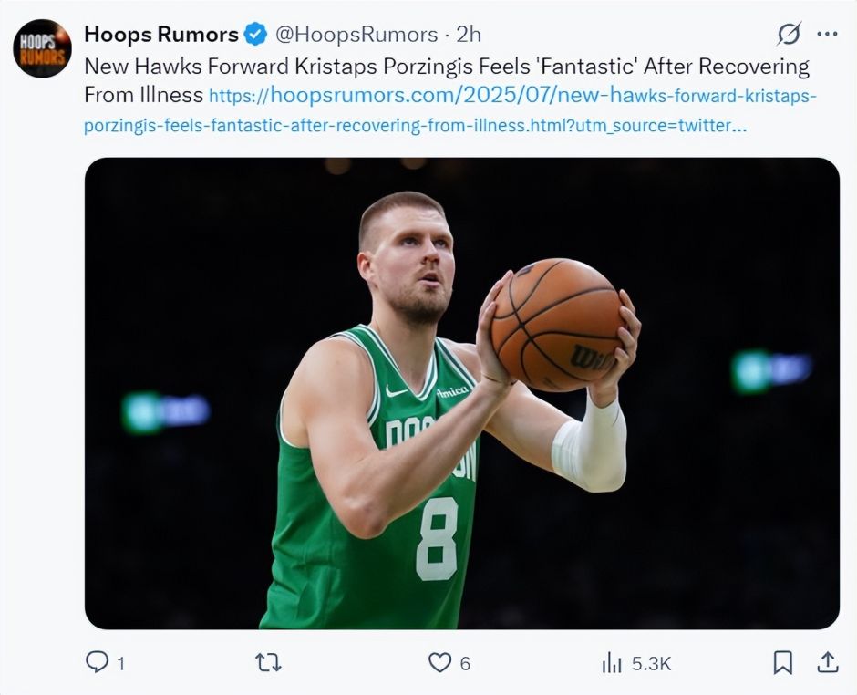 北京时间7月30日,老鹰新援波尔津吉斯在采访中透露自己的“病毒后综合症”已经痊愈了,他将代表拉脱维亚参与欧锦赛之后前往亚特兰大参与训练营。
