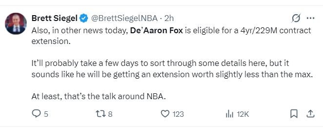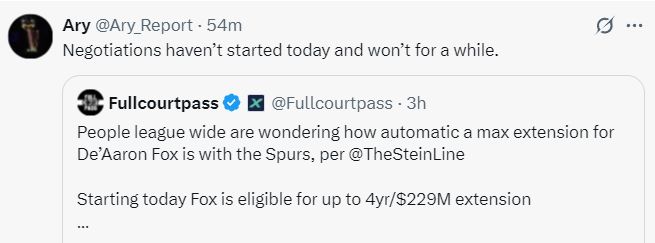 随后美记Ary转推回复——福克斯的续约谈判尚未开始,而且短期内也不会开始。