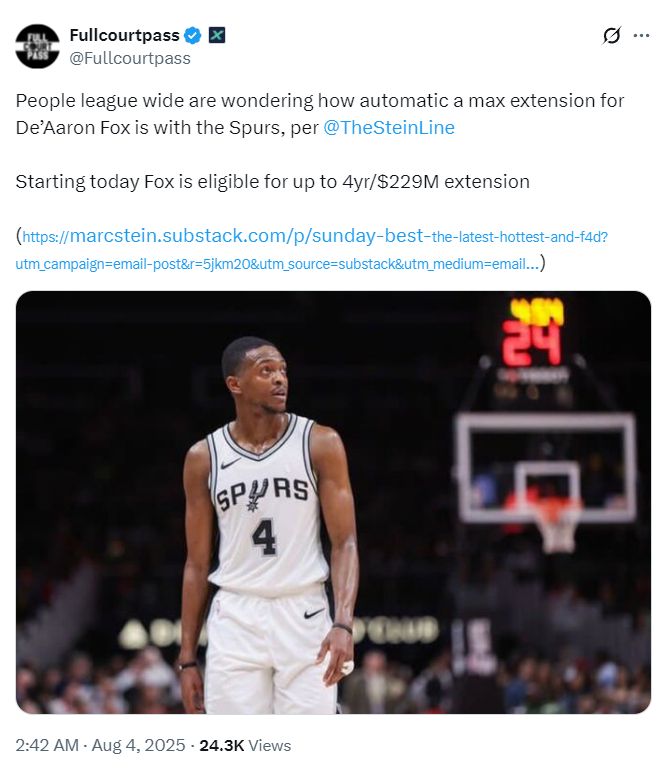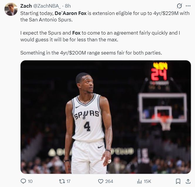 《纽约邮报》记者马克-斯坦恩也透露从今日起福克斯就有资格跟马刺达成四年2.29亿的顶薪提前续约。全联盟都在猜测马刺与福克斯的续约是否会顺利达成。