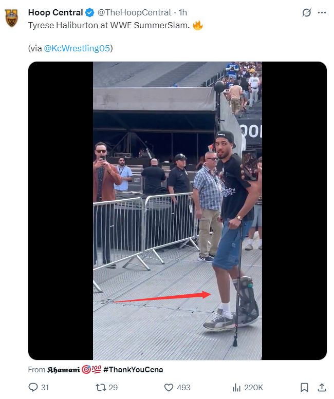 哈利伯顿在NBA总决赛中遭遇了右脚跟腱撕裂的大伤,他进入WWE夏赛现场时是拄双拐+穿着保护靴,有步行者球迷还为此感到难过,因为哈利伯顿是为了球队才遭到如此重伤。