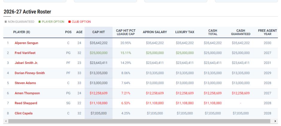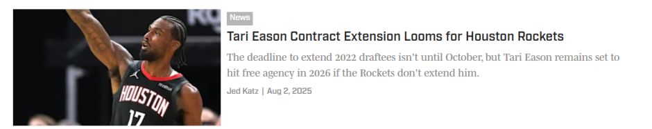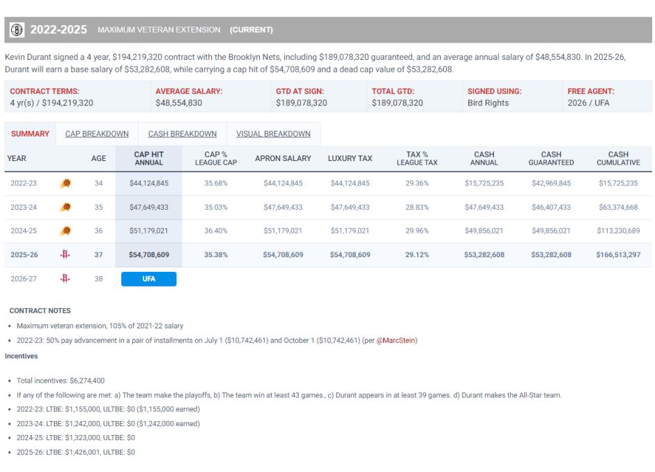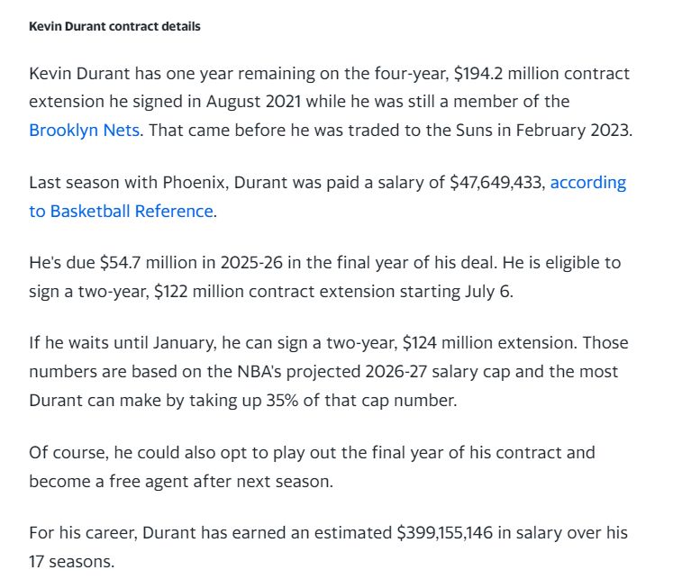 根据此前薪资结构专家鲍比-马克斯的分析,杜兰特今夏可以跟火箭续约一份两年价值1.22亿的顶薪,如果等到2026年一月工资帽再度上涨后他可以签下一份两年1.24亿的顶薪,这两份顶薪均薪都超过6000万,但为何火箭迟迟没有下手呢?
