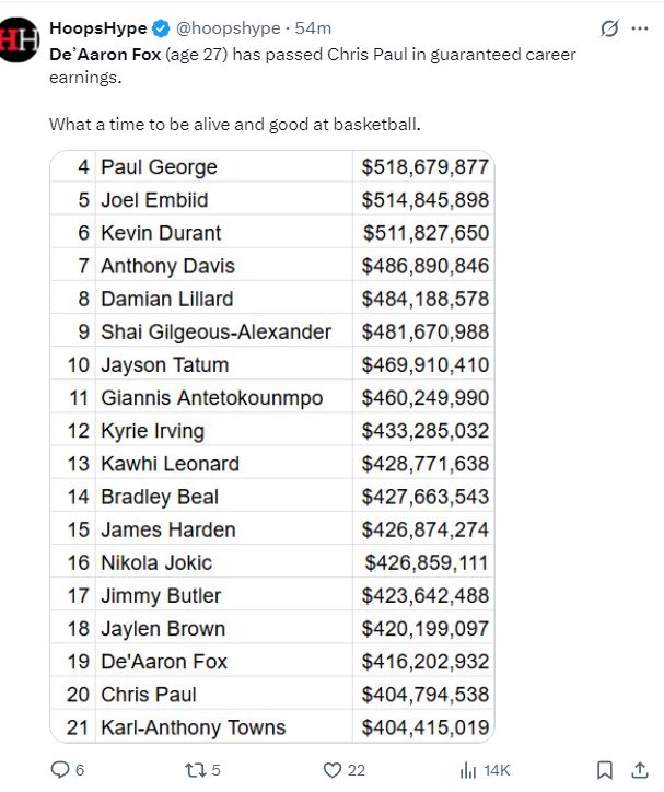 根据美媒HoopsHype的报道,在福克斯拿到这份四年2.29亿顶薪后他已经进入NBA历史薪资榜前20超过了保罗的4.04亿,福克斯已经拿到4.16亿成为历史薪资榜第19。