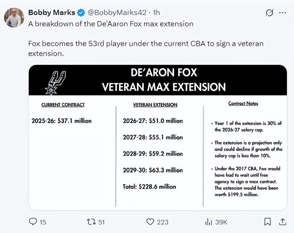 Shams在推文中写道,Klutch Sports首席执行官里奇-保罗告诉ESPN福克斯已经同意与马刺签下四年2.29亿的顶薪。福克斯上赛季被交易到马刺,只打了17场比赛场均19.7分6.8助攻,他在3月18日接受了左小指肌腱手术。