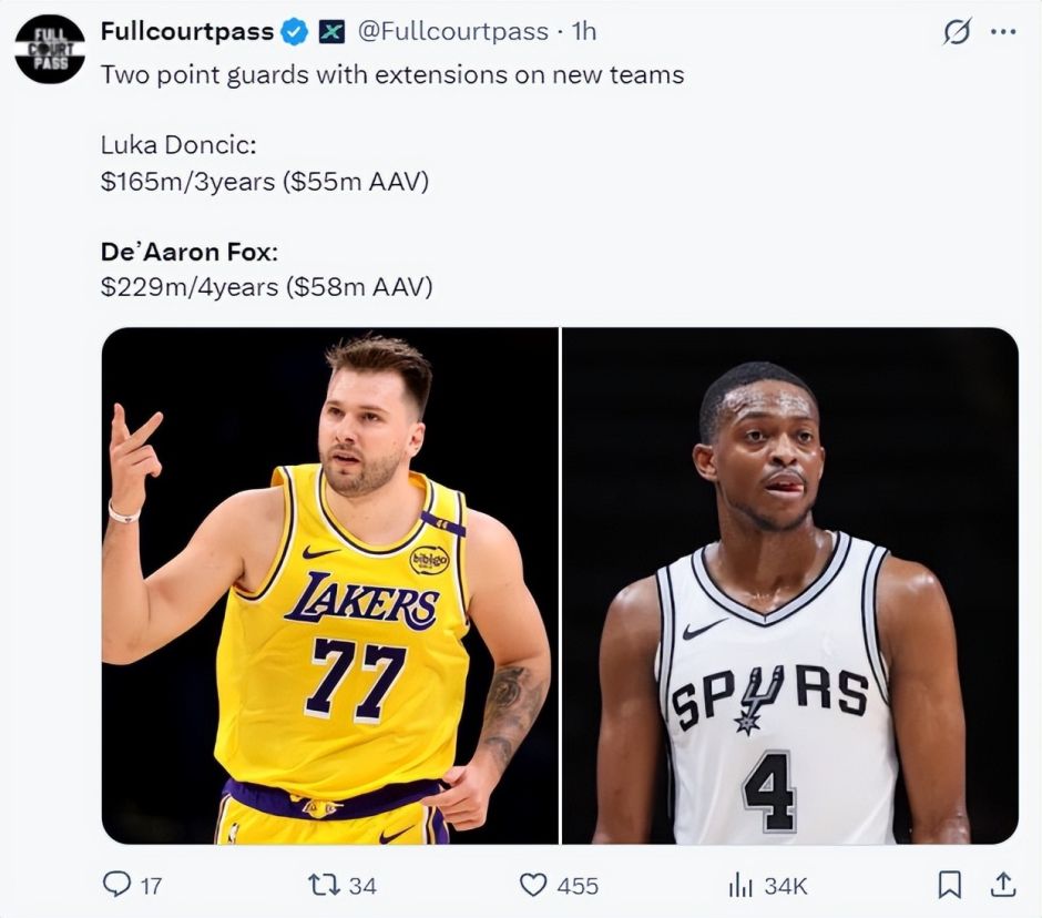 福克斯这份四年2.29亿的顶薪比东契奇三年1.65亿平均年薪还要高出300万,东契奇均薪5500万,福克斯均薪5800万。