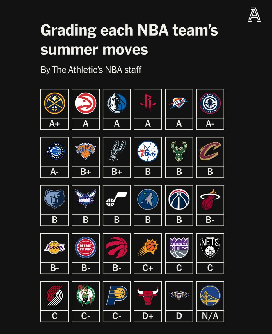 TA为各队今夏运作评级:掘金A+火箭A快船A-湖人B- 勇士无运作