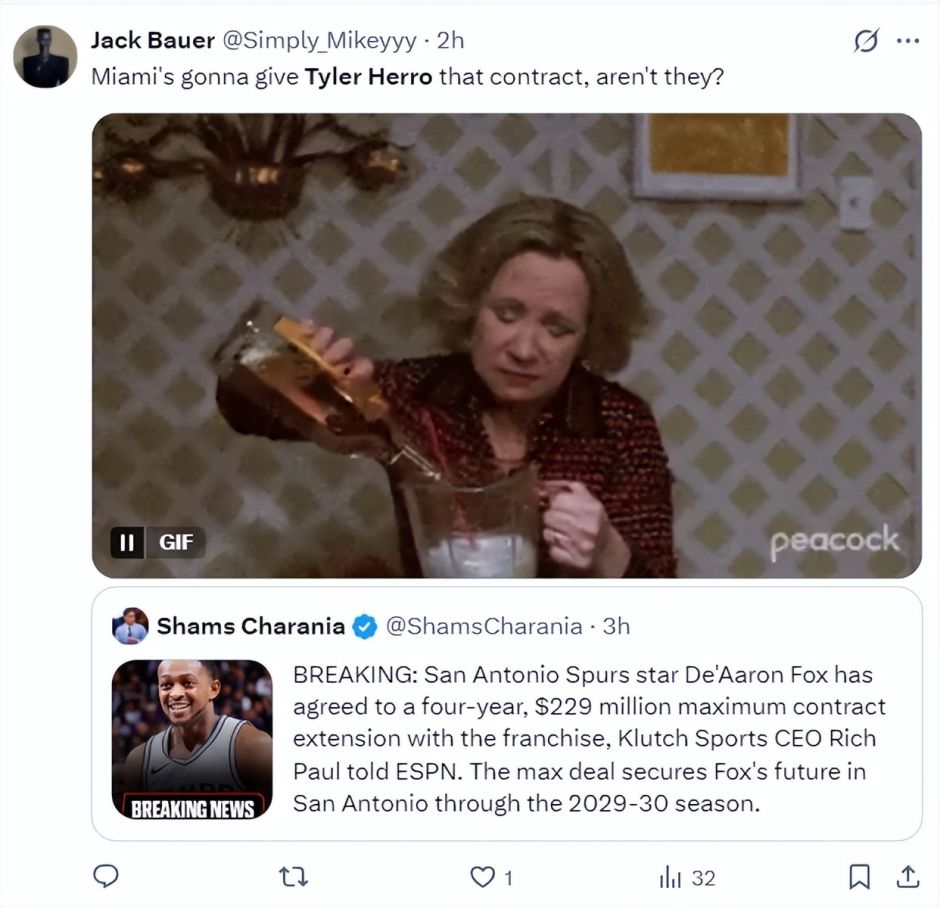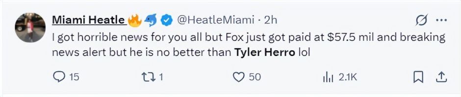 有热火球迷转发福克斯与马刺续约四年2.29亿后写道:那么迈阿密热火会给希罗类似的合同对吧?