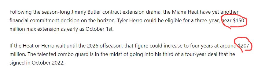 希罗目前四年1.2亿的合同进入最后两年,但他没有球员选项,他今夏可以跟热火提前续约最高三年1.5亿的顶薪合同,如果到2026年夏他可以签下一份四年2.07亿的超级顶薪,换言之今夏顶薪是均薪5000万,明夏均薪达到5175万。