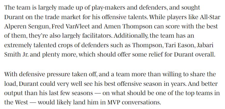 火箭队的体系已经成型,现在就需要杜兰特展现他的进攻天赋,申京、阿门、小贾、伊森都会为杜兰特减轻,杜兰特能在这套体系中打的轻松,随着防守压力的下降,杜兰特可能会迎来他大伤后最好的进攻赛季,他在西部最好球队之一,可能会让他成为MVP。