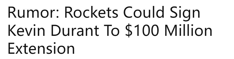 “杜兰特当前的合同还剩一个赛季。尽管他可能不会在7月具备续约资格时就签下续约合同,但球队消息人士表示,大家坚信这将是一段长期的合作关系。从理论上讲,火箭队的前景看起来极为光明。”