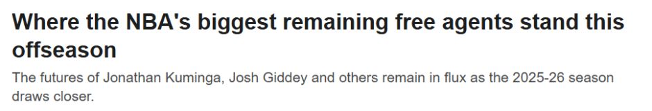 北京时间8月12日,随着2025-26赛季的日益临近,NBA大多数球队都在对阵容进行最后的调整。仍有一些自由球员尚未确定下家——部分球员因合同问题陷入僵局,另一些则在纠结赛季开始时将为哪支球队效力。库明加、吉迪和威斯布鲁克等人都在等待敲定自己的未来。ESPN撰文解读了剩余七位最重要的自由球员,分析他们在谈判中的处境,以及有限的薪资空间如何影响联盟格局——