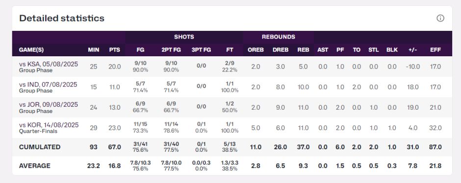 胡金秋这四场比赛,合计已经拿到67分37篮板2抢断1盖帽,美中不足是0次助攻,正负值+31,效率值87。