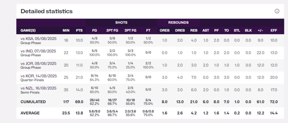首次进入国家队的王俊杰场均23.5分钟,拿到13.8分4.2篮板1.2助攻0.2抢断,命中率62.2%,三分命中率55.5%,正负值+12.2,效率值14.4,他已经成为本届亚洲杯最高光的年轻新星。