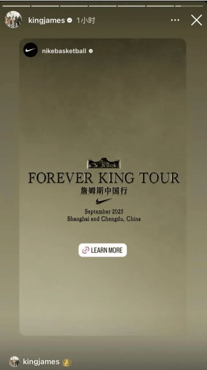 北京时间8月22日晚,勒布朗-詹姆斯个人在IG上转发了耐克官宣的中国行活动,老詹将在九月份开启2025“Forever King Tour”中国行,到访上海和成都两座城市,这也是詹姆斯的第15次中国行。老詹个人也评论了一个皇冠的图样。