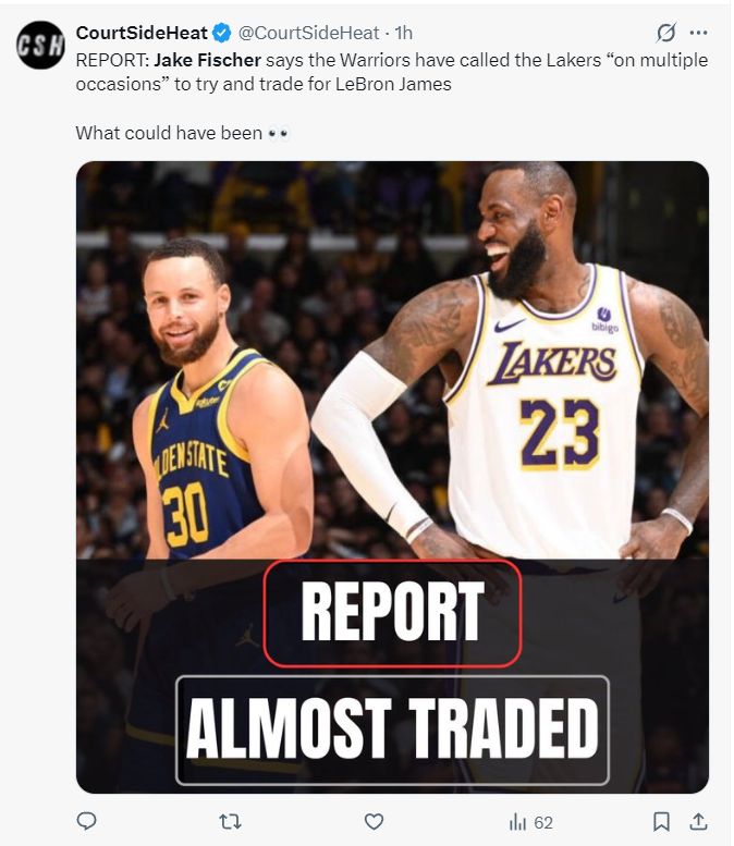 北京时间8月23日,BR记者杰克-费舍尔透露,金州勇士队曾多次致电洛杉矶湖人队探讨交易勒布朗-詹姆斯,勇士很希望库里与詹姆斯联手。勇士队在过去18个月内多个场合致电湖人,看看是否能想到办法交易得到詹姆斯。