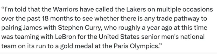 实际上在一个月之前,ESPN的记者蕾梦娜-谢尔伯恩也透露过勇士好几次都在询价勒布朗-詹姆斯,去年夏天勇士也曾询价过詹姆斯。
