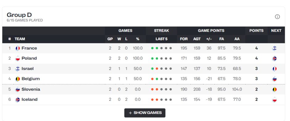 D组的情况,法国二连胜、波兰二连胜、以色列1胜1负、比利时1胜1负、斯洛文尼亚2连败、冰岛二连败。
