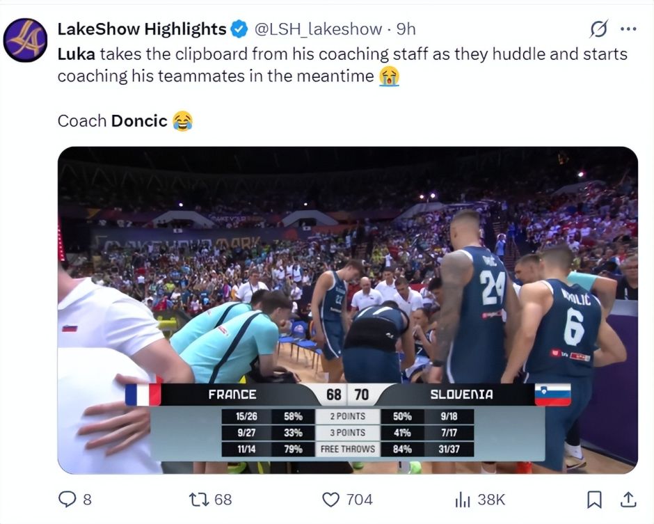 这场比赛卢卡-东契奇的求胜心之旺盛,在斯洛文尼亚70-68领先法国的暂停期间,斯洛文尼亚三个教练在说着些什么,东契奇一把从主帅手中接过战术板,随后他让球员们过来开始画战术、讲解战术。