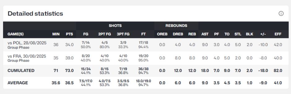 对阵法国这场20中8,三分10中4,罚球20中19,拿到39分9助攻8篮板2抢断;