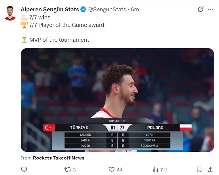 关键是这7场比赛申京带领土耳其全部拿下胜利,目前土耳其7连胜晋级四强,申京也是赛事MVP的第一热门人选。