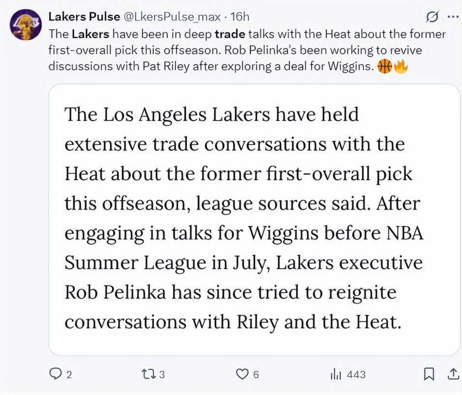 洛杉矶湖人队的确想重启与迈阿密热火队的交易谈判,他们想要得到顶级防守侧翼安德鲁-维金斯,此举就是为了提升先发阵容的防守能力,但热火队对维金斯的要价较高,湖人目前无法满足热火的要价,双方的谈判陷入僵局。