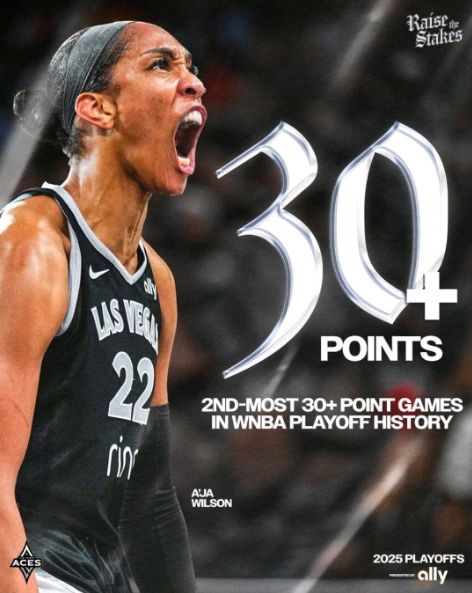 阿贾-威尔逊季后赛7次轰下30+得分,位列季后赛历史第二位。