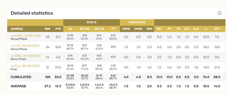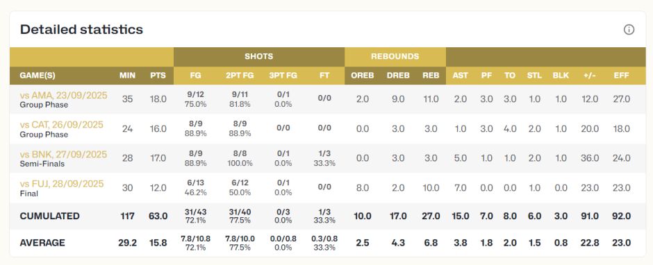 亚俱杯最佳阵容是看整个赛程的综合表现,陈明伶场均29.2分钟,拿到15.88分6.8篮板3.88助攻1.5抢断0.8盖帽,命中率72.1%,她才是广东第一王牌。