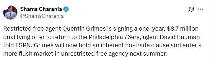 北京时间10月2日,据名记Shams报道,费城76人队受限制自由球员昆汀-格雷姆斯已决定接受一份为期一年、价值874万美元的资质报价。