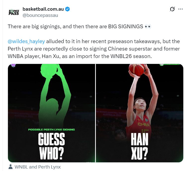 北京时间10月7日,根据澳洲媒体wildes_hayley的报道,WNBL球队珀斯山猫队即将跟中国超级巨星、前WNBA球员韩旭签约,韩旭将成为25-26赛季珀斯山猫的外援。