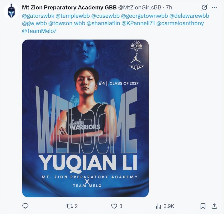 北京时间10月8日晚,据媒体人“NGstar_Pai”消息,中国女篮核心李月汝的妹妹李玉乾将在新学期留洋,她将加盟美高 Mt. Zion Preparatory Academy新赛季她将代表 Team Melo 征战AAU赛事。
