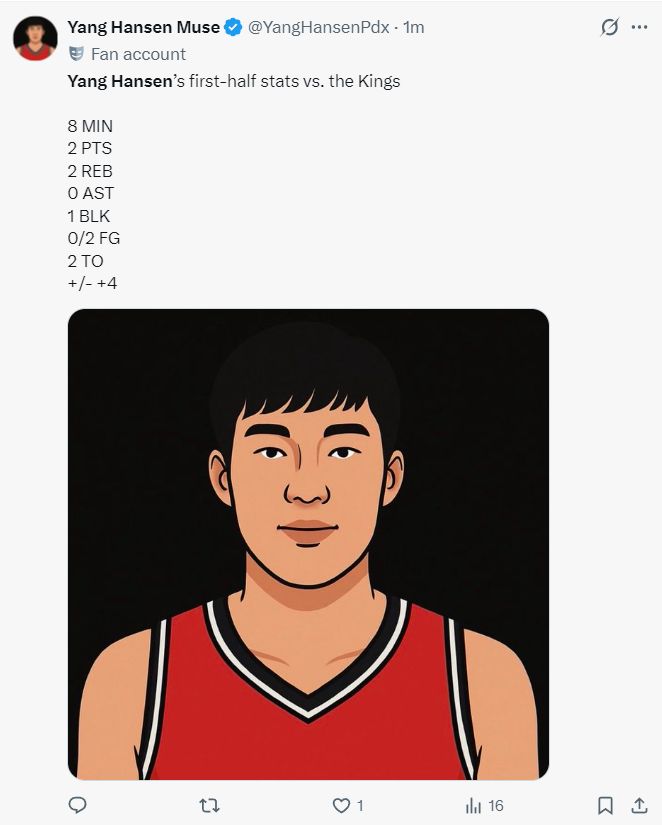 开拓者球迷:开拓者过去12分里有10分是杨瀚森一人拿的。