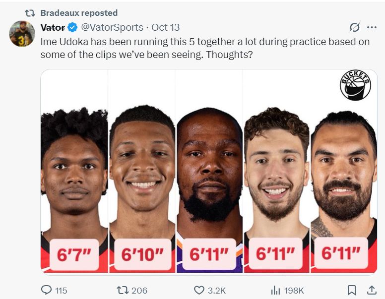 就算是伊森先发,那么也是阿门6尺7、伊森6尺8、小贾巴里6尺10、杜兰特6尺11、申京6尺11,这套先发阵容平均身高也有2.068米。
