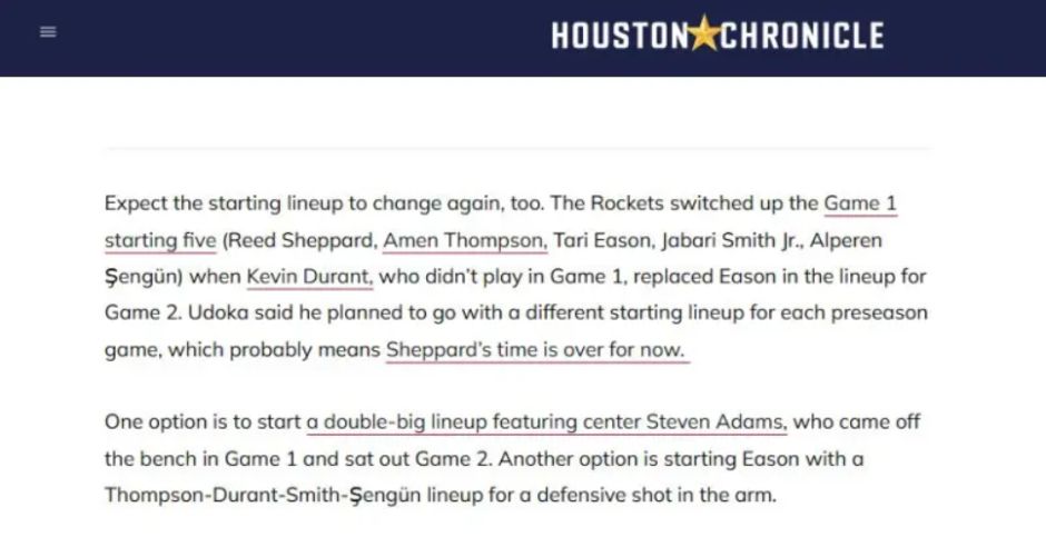 文中她写道:预计火箭的首发阵容会再次改变,第一场是用谢泼德、阿门、伊森、小贾巴里、申京,第二场杜兰特复出顶替了伊森的先发。