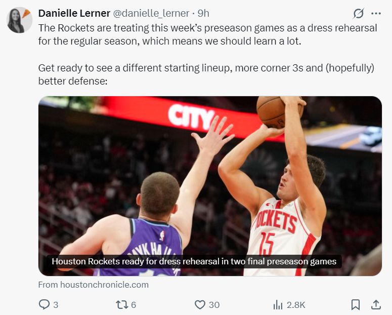 《休斯顿纪事报》记者Danielle Lerner在球队飞往新奥尔良之前发文,接下来本周的季前赛会是常规赛预演,准备好迎来全新的先发阵容,更多的战术、更出色的防守吧。