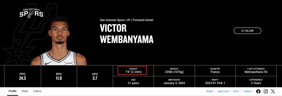 实际上NBA官方文班亚马的身高数据根本没有变过,还是7尺3,文班亚马怎么可能一个夏天就长到2.31米,要知道他已经21岁了,又不是14-15岁。