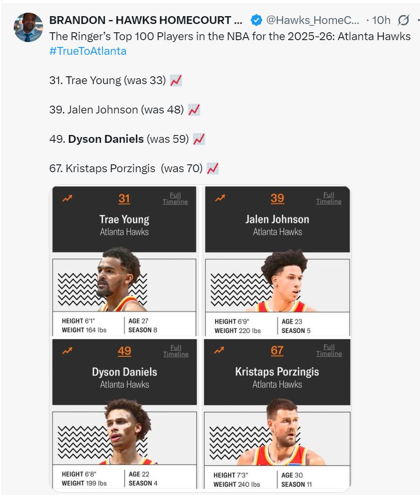 老鹰队在前100球员中只有四人,戴森排在第49,仅次于特雷杨、杰伦-约翰逊,也就是老鹰的第三巨头。