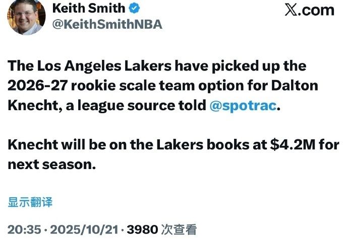 北京时间10月21日,根据NBA记者Keith Smith报道,湖人已经执行24岁年轻球员克内克特的2026-27赛季价值420万美元的球队选项。只是克内克特自从上赛季交易告吹后,他重返湖人就状态持续下滑,在此前的季前赛表现被外界批评为“负资产”,湖人想要交易他存在困难。