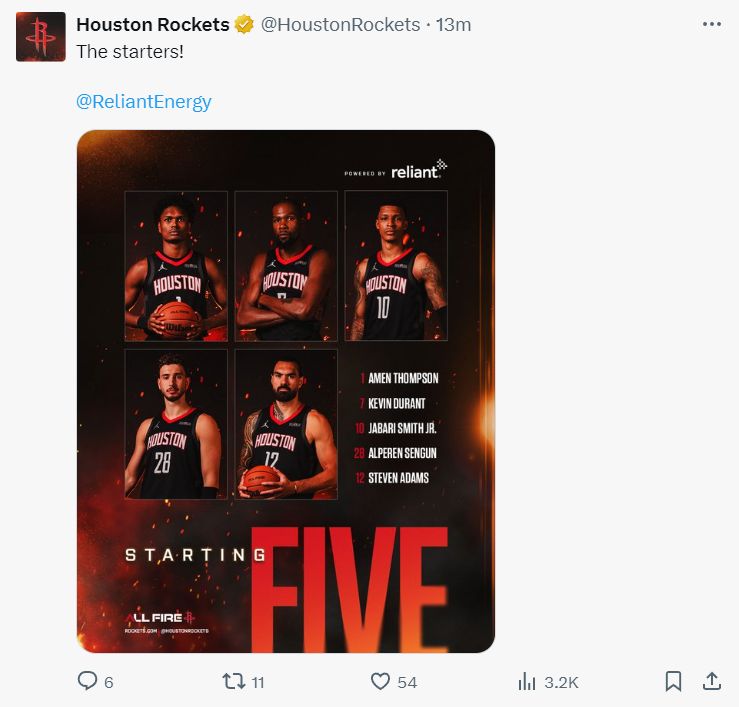 火箭:阿门、杜兰特、史密斯、申京、亚当斯;