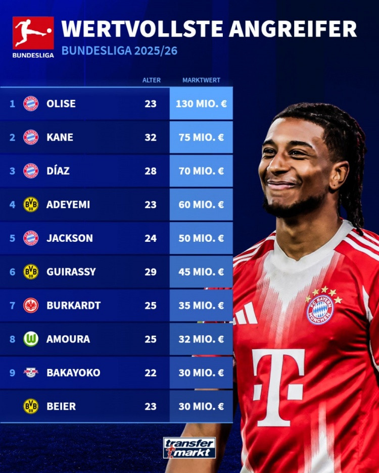 24直播网10月25日讯,德转市场统计了德甲新赛季进攻球员身价排行,奥利塞以1.3亿欧元断崖式领先排名榜单第一,凯恩7500万欧元紧随其后。