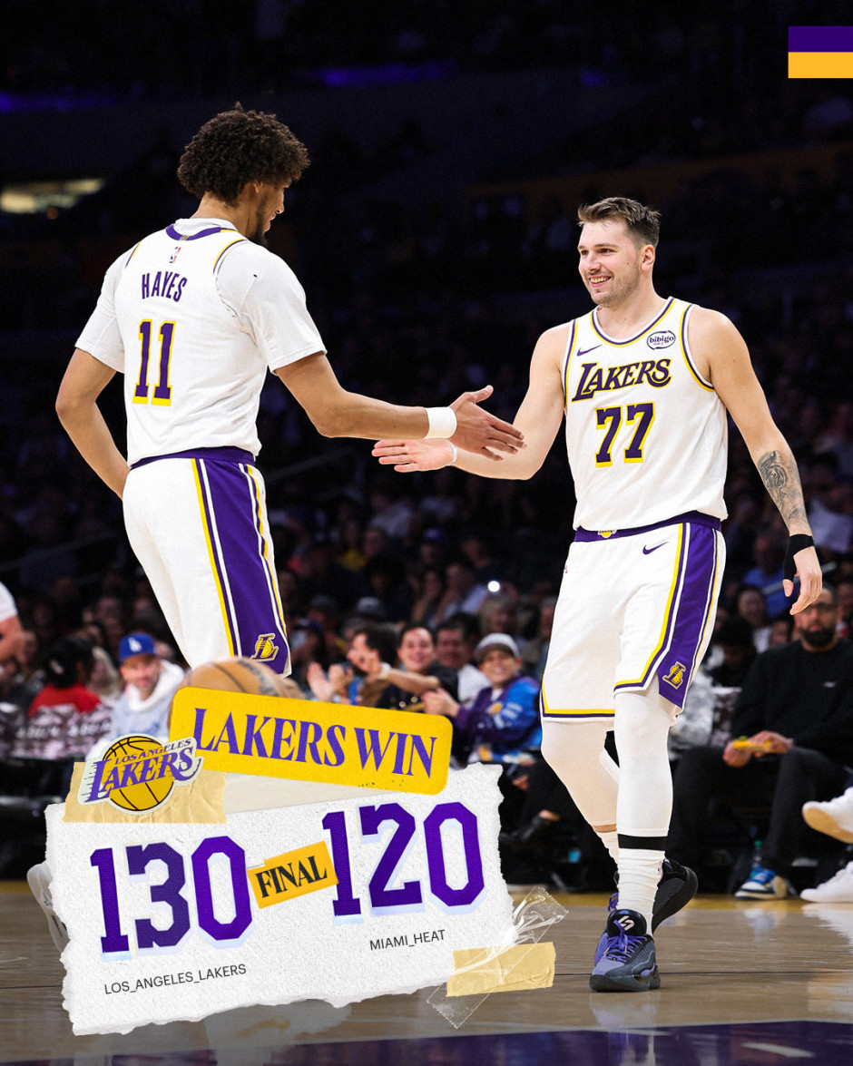 湖人主场对阵热火的比赛中,以130-120取得胜利,迎来三连胜。东契奇手感不佳贡献29分11篮板10助攻的三双数据,里夫斯也有26分11助攻的出色表现。而真正让这场胜利另一大惊喜是两位新援——斯玛特和拉拉维亚的稳定发挥。