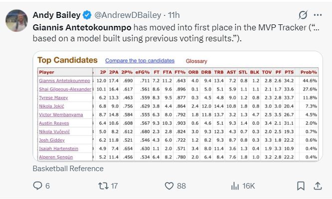 在数据网站BBR上,扬尼斯的MVP概率高居44.6%排在联盟第一,SGA、马克西、约基奇、文班亚马都在扬尼斯之后。