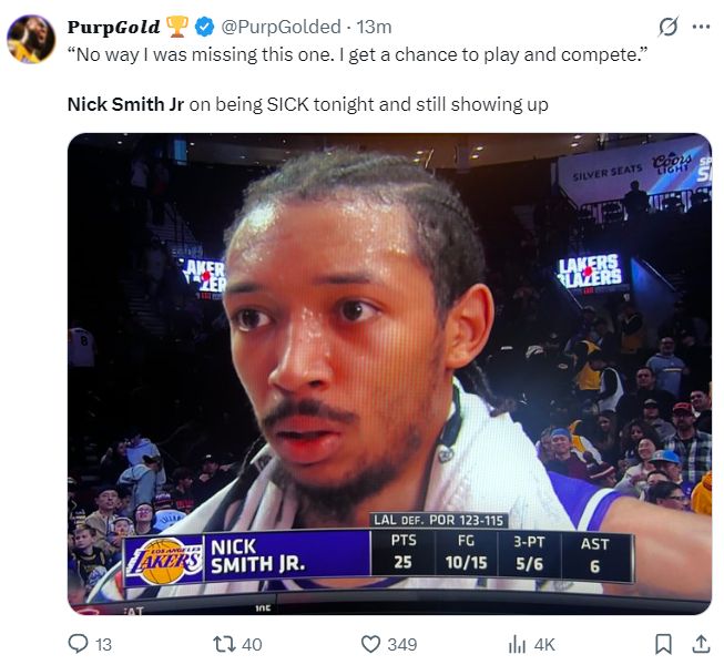 赛后根据《湖人国度》的报道,尼克-史密斯在这场比赛之前遭遇了流感,所以这场比赛是流感之战,最终他27分钟拿到25分。
