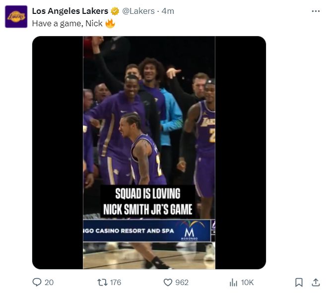 赛后尼克-史密斯登上了全美第二热搜,这位拿着双向合同的后卫迎来了湖人生涯之夜,他还差3分就追平个人NBA生涯最高的28分。