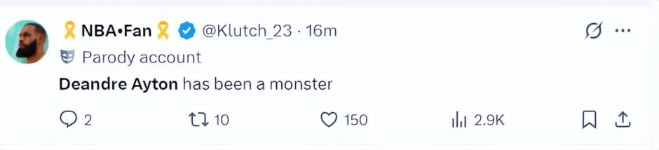 艾顿31分钟,19中14,命中率73.7%,拿到29分10篮板2助攻3盖帽,这个表现很炸裂。