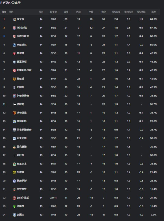 24直播网11月05日讯,英冠第14轮部分比赛于今日凌晨结束,在本场比赛中斯托克城3-0牛津联,莱斯特城1-1米德尔斯堡,考文垂3-1谢菲尔德联。