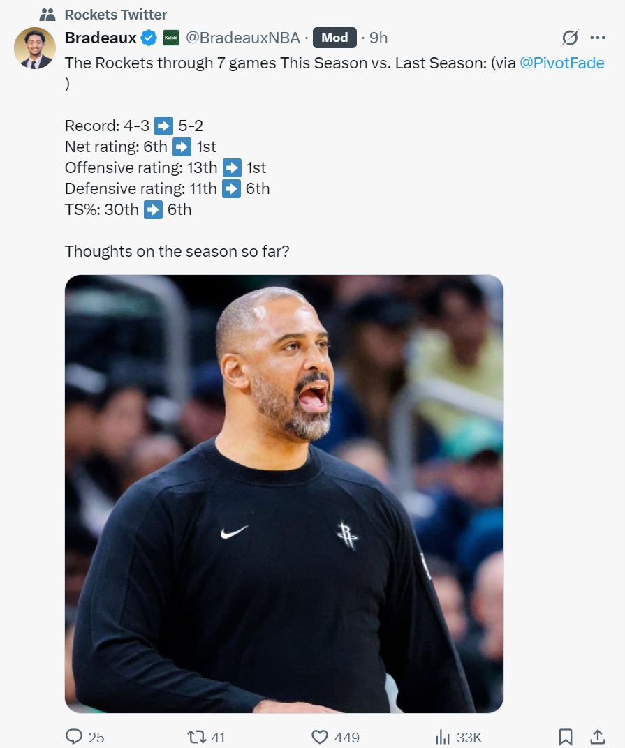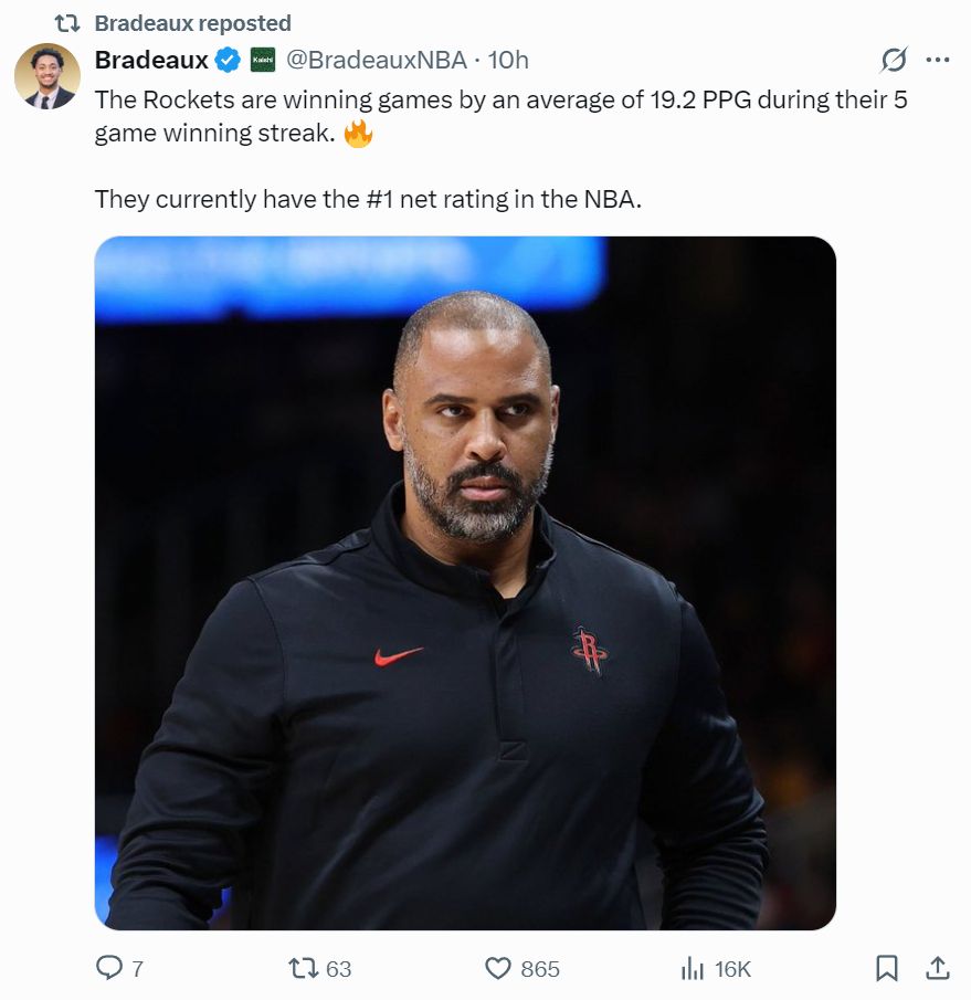 火箭击败灰熊后已经拿到五连胜,火箭也冲到了西部第三的席位,从二连败西部倒数一跃成为西部第三,短短两周时间那些质疑声仿佛全然消失了,这支没有控卫的火箭还是能找到赢球的法宝。