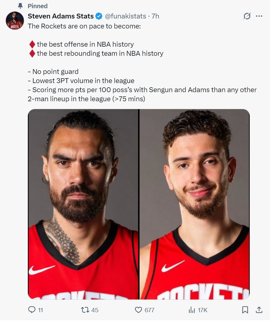 申京、亚当斯的双塔依旧是火箭最强的杀招,这个杀招在上赛季交易截止日后就让联盟胆寒,本赛季申京与亚当斯一同登场,每100个回合得分高于联盟任何双人组合