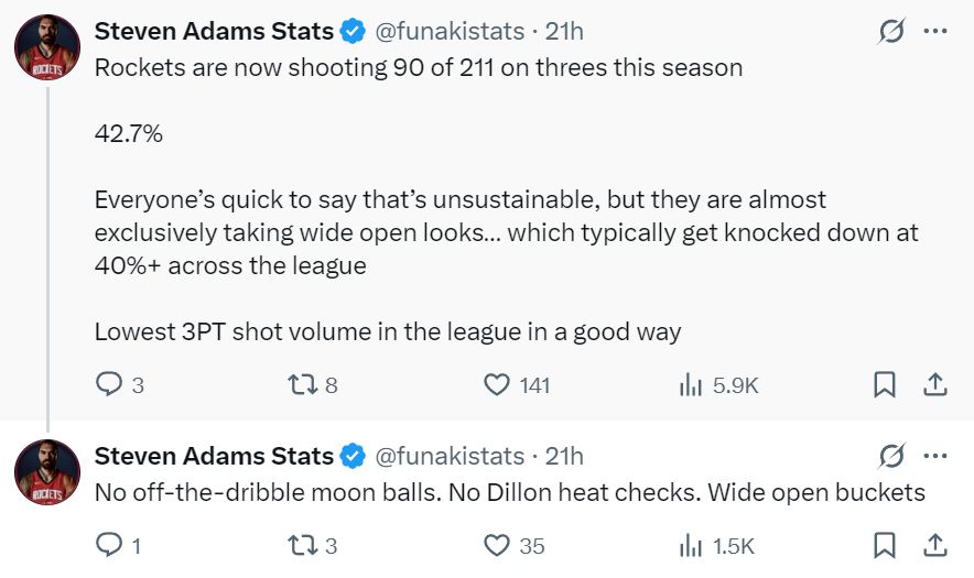 火箭队目前三分球211中90,三分命中率高达42.7%,或许很多人觉得这种高命中率不可持续,火箭并不是一支痴迷三分球的球队,火箭的三分机会大多数都是空位,所以能投出超过40%的命中,以少的出手来换取准的命中率是正确的选择。