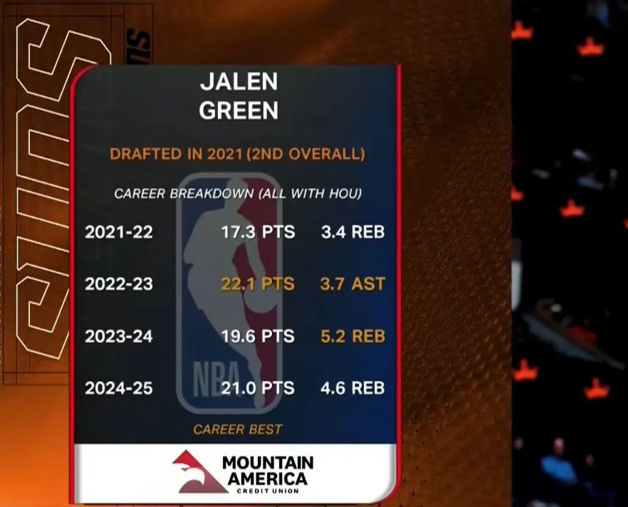 转播方给到杰伦-格林此前四个赛季的数据,上赛季场均21分4.6篮板。
