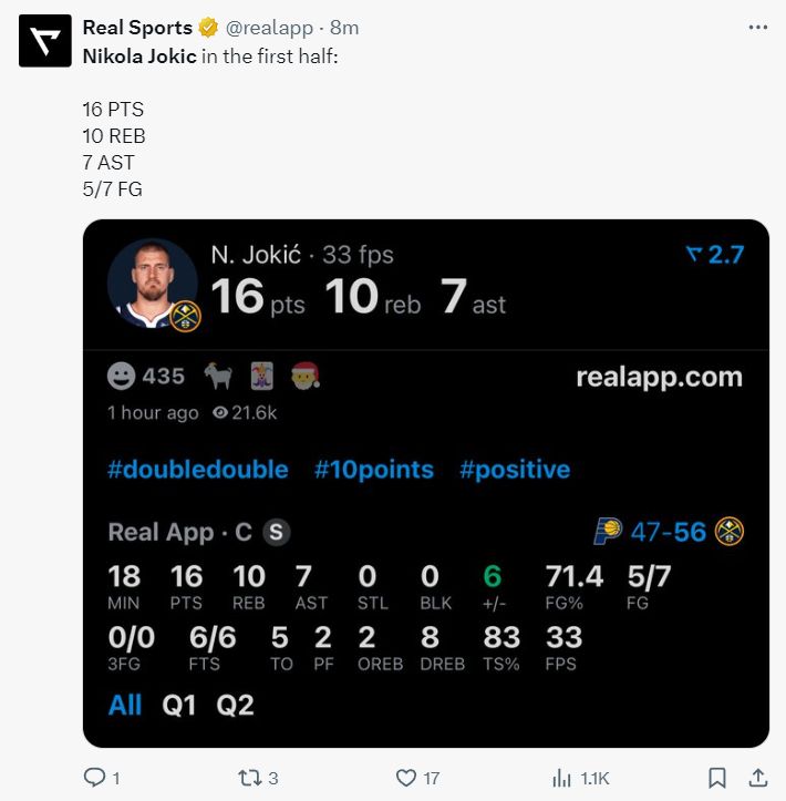 约基奇这场比赛开场就进入炸裂模式,单节打满12分钟,6中5,各种在篮下肆虐,拿到10分9篮板5助攻,这个数据又要冲着三双去了。